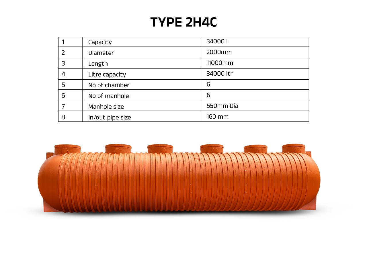 The Type 2H4C (34,000 Litres) UNITED Polyethylene Septic Tank is an ultra heavy-duty, very high-capacity wastewater management solution engineered for mega commercial complexes, institutions, townships, and large infrastructure projects. Manufactured using premium UV-stabilised polyethylene, this septic tank delivers exceptional durability, corrosion resistance, and a completely leak-proof structure. Its advanced multi-chamber internal configuration ensures efficient waste separation and treatment, while the reinforced ribbed cylindrical body provides outstanding load-bearing strength for underground installation. Ideal for continuous high-usage environments requiring long-term, low-maintenance sanitation systems.